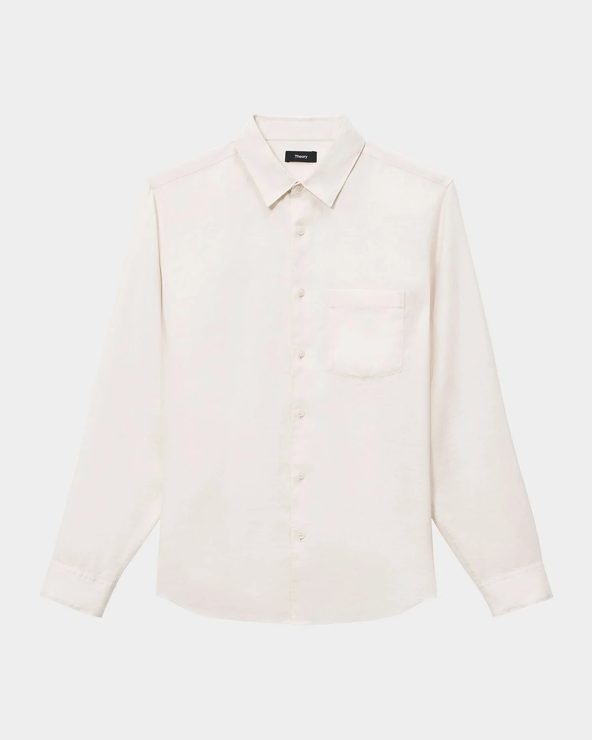 - Theory "Irving" solid sport shirt - Point collar; button placket - Long sleeves - Barrel cuffs - Regular fit - Linen - Dry clean - Imported - Fashioned for change: responsible manufacturing. Find out more - here