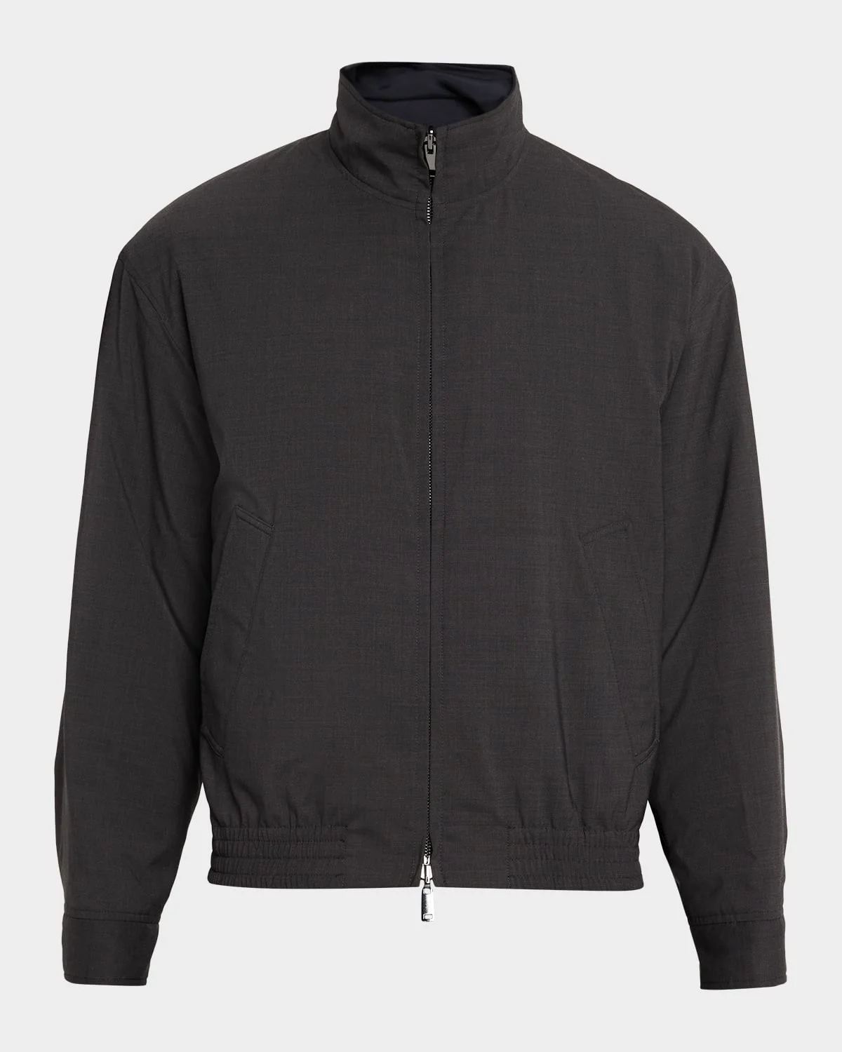 The "St Clair" jacket from Theory is crafted of a breathable, wrinklereleasing wool blend with a hint of stretch Reverses from sleek motion nylon to motion wool Stand collar Long sleeves; button cuffs Side slant pockets Standard fit Elasticized hem Button front closure Virgin wool/polyester/spandex Dry clean Imported