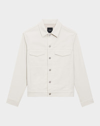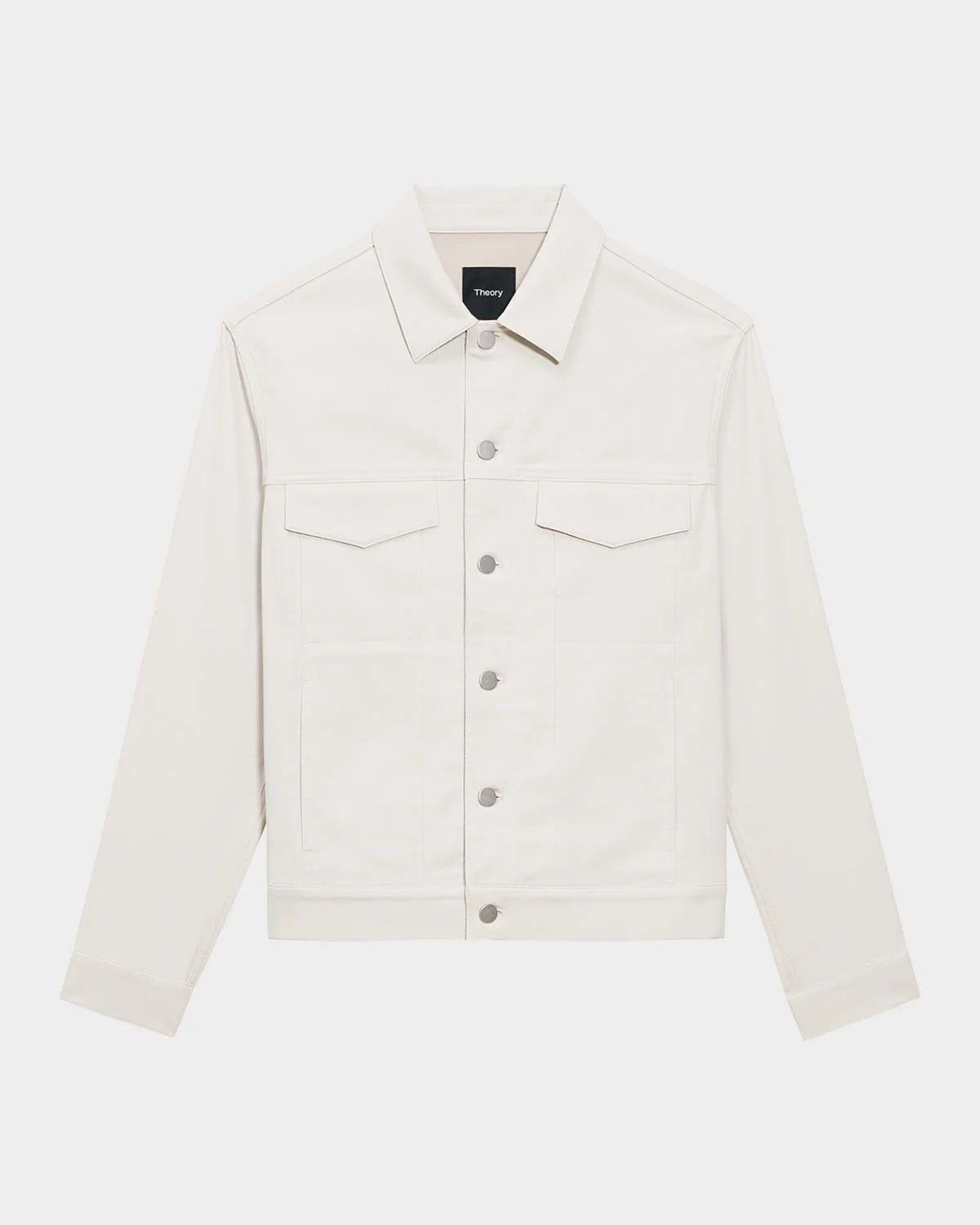 - Theory trucker jacket in technical twill with 4-way stretch - Spread collar - Yoked front and back shoulders - Button front closure - Two chest flap pockets - Side slip pockets - Long sleeves with buttoned cuffs - Cotton/nylon/polyamide/spandex - Machine wash cold, line dry - Imported - Model is 6'1"/185cm.