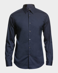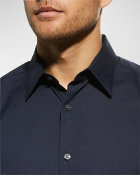 - Theory Sylvain woven shirt. - Approx. measurements: - 27"L front; 30"L back; 26"L sleeve. - Spread collar; French-placket button front. - Barrel cuff. - Yoked back shoulders; darted back. - Cotton/nylon/elastane. - Machine wash. - Imported. - Model is 6'1"/185cm.