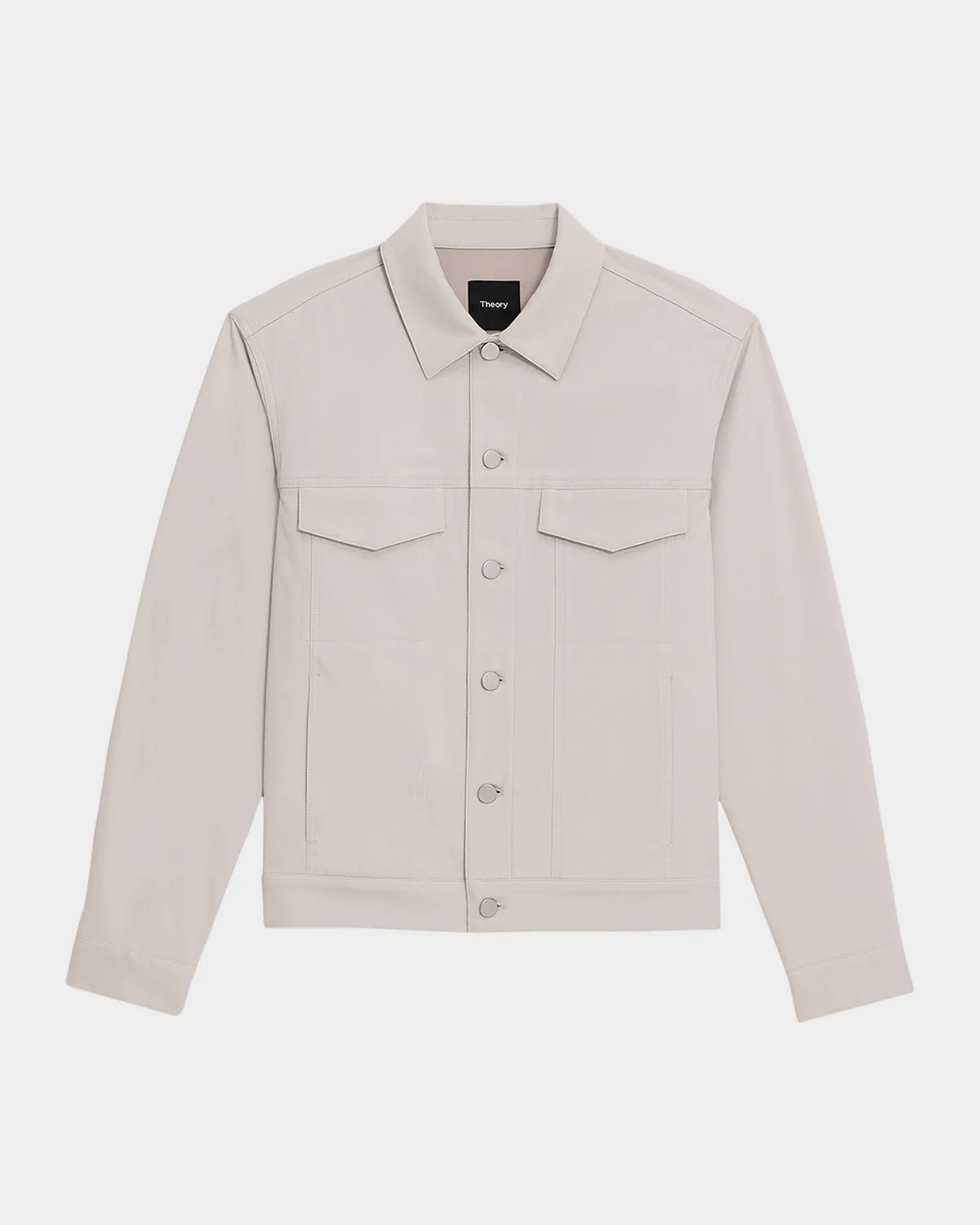 - Theory "River" trucker jacket crafted from neoteric twill, a breathable performance fabric that boasts four-way stretch - Spread collar; button front closure - Chest flap pockets - Side slip pockets - Regular fit - Long sleeves - Button cuffs - Cotton/nylon/Lycra® spandex - Dry clean - Imported - Fashioned for change: responsible manufacturing. Find out more - here