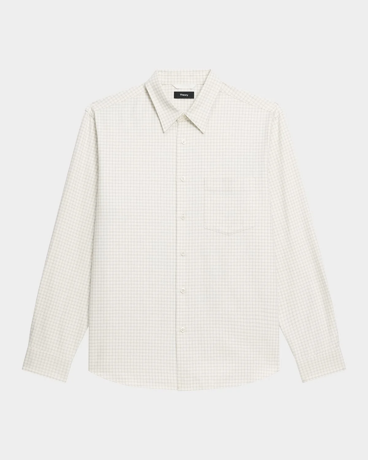 The "Weekend" shirt by Theory is woven using soft cotton for a warm flannel finish with a chest patch pocket for a classic, convenient touch. Point collar Button placket Chest pocket Long sleeves Round barrel cuffs Pleated back yoke Curved hem Modern fit Cotton Machine wash Imported