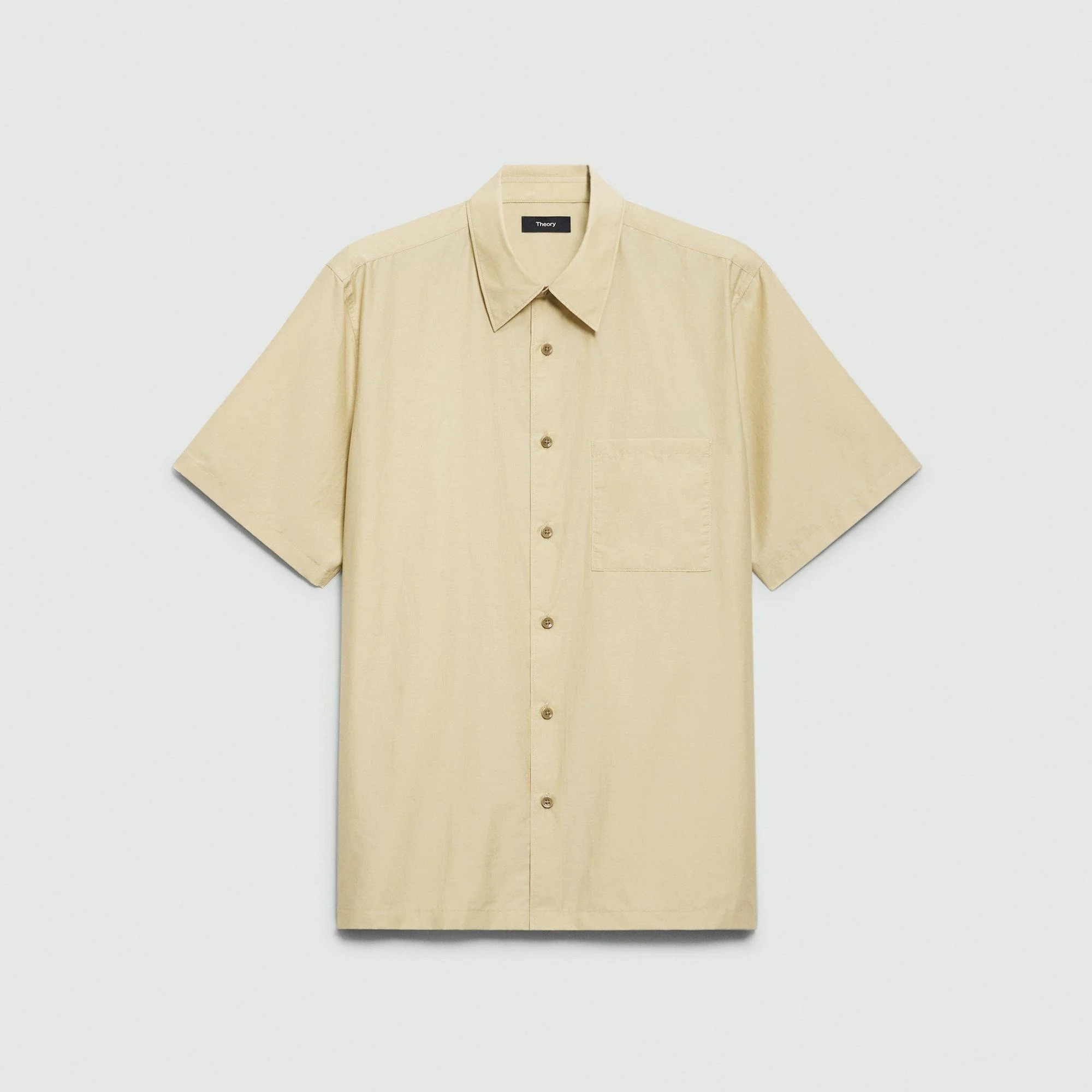 Please enter your email below to be notified when this item is in stock This short-sleeve shirt is a relaxed button-up with a pointed collar and chest patch pocket. A warm weather essential that travels well, this style is crafted using a blend of cotton and nylon which gives a slight sheen and modern feel, while the tumbled finish gives a casual yet still refined look. Style #: P0574506 Please enter your email below to be notified when this item is in stock Fit True to size, choose your normal size Standard fit, short sleeves Hip length Model is 6’2”, chest 38” and wearing a US size M Materials & Care Composition 68% cotton 32% recycled nylon Care Machine wash cold, gentle cycle. Do not bleach. Hang to dry in shade, do not tumble dry. Cool iron if needed, light steam if needed. Dry clean with any solvent except trichloroethylene. Imported