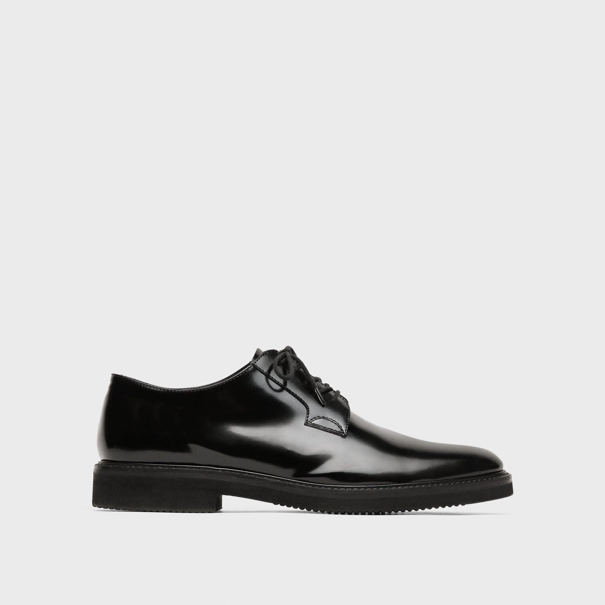 Our approach to the classic Oxford is crafted in Italy with a minimalist laced upper, and rounded toe in polished calfskin leather. Completed with comfortable rubber soles, this style is crafted with fully cushioned insoles and a goat leather lining. We are proud to use sustainable packaging for our footwear. Our shoe box is made from 100% certified recycled fibers from post-consumer waste. Every aspect of this box’s construction is recyclable. From the white paper that wraps the box to the cardboard to the glue that holds it all together. Style #: O0170003 Fit True to size, choose your normal size If in between sizes, we recommend sizing up Materials & Care Composition 100% calf leather Care Professional leather clean only. Imported