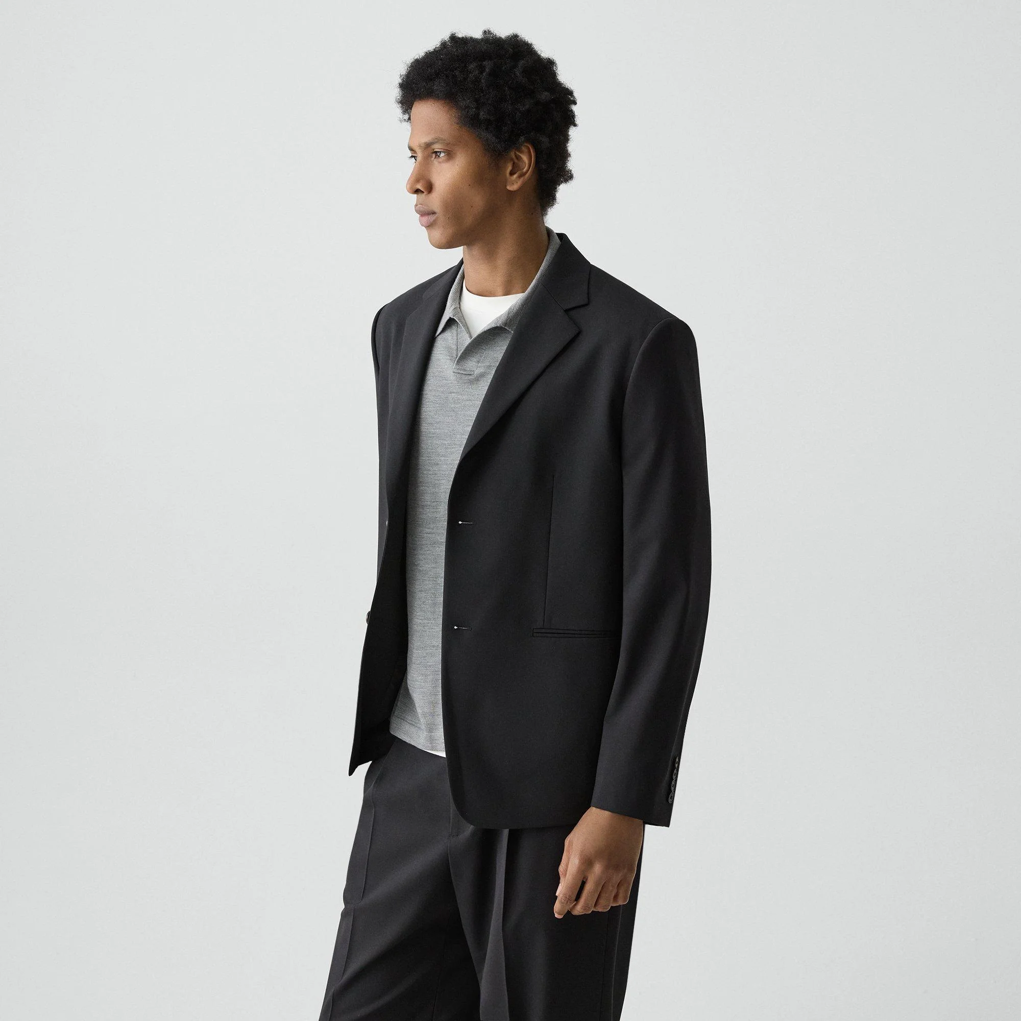 Please enter your email below to be notified when this item is in stock Fully lined, this two-button blazer is detailed with notch lapels and side flap pockets. It’s tailored to a more relaxed fit and constructed from fine, medium-weight wool with inherent moisture control and wrinkle resistance for all-day polish. Style #: P0771111 Please enter your email below to be notified when this item is in stock Fit True to size, choose your normal size Regular length Model is 6’2”, chest 38” and wearing a US size 38/38R Discover the best fit for you on our. Materials & Care Composition 97% virgin wool 3% spandex Care Do not wash. Do not bleach. Do not tumble dry. Cool iron if needed. Dry clean with any solvent except trichloroethylene. Imported