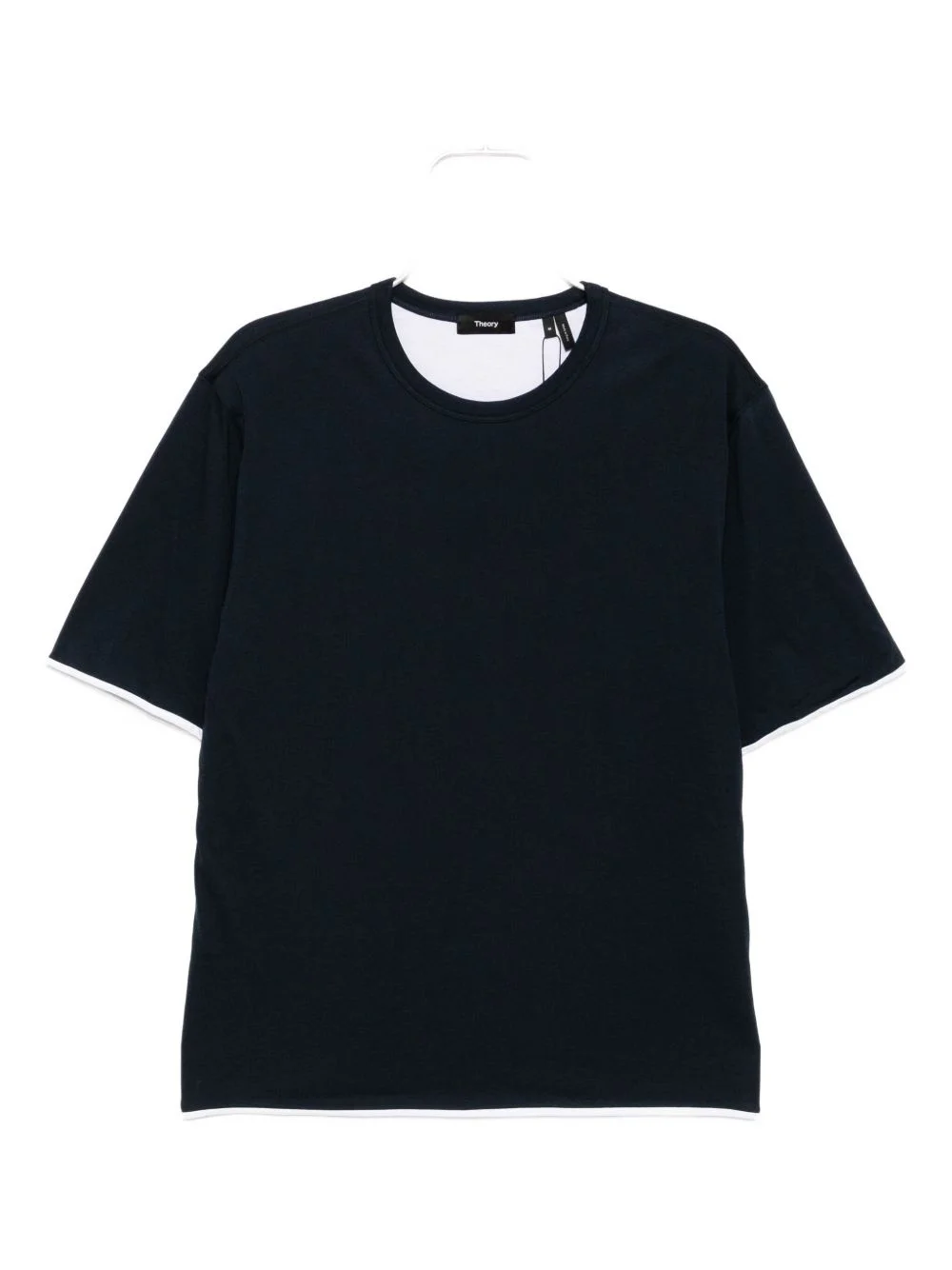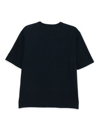 THIS NAVY BLUE SHORT-SLEEVED T-SHIRT FEATURES A CLASSIC CREW NECK AND A STRAIGHT HEM FOR A CLEAN, VERSATILE FIT. CONTRASTING TRIM DETAILS ADD SUBTLE VISUAL INTEREST, ENHANCING ITS REFINED YET CASUAL STYLE SUITABLE FOR EVERYDAY WEAR.
