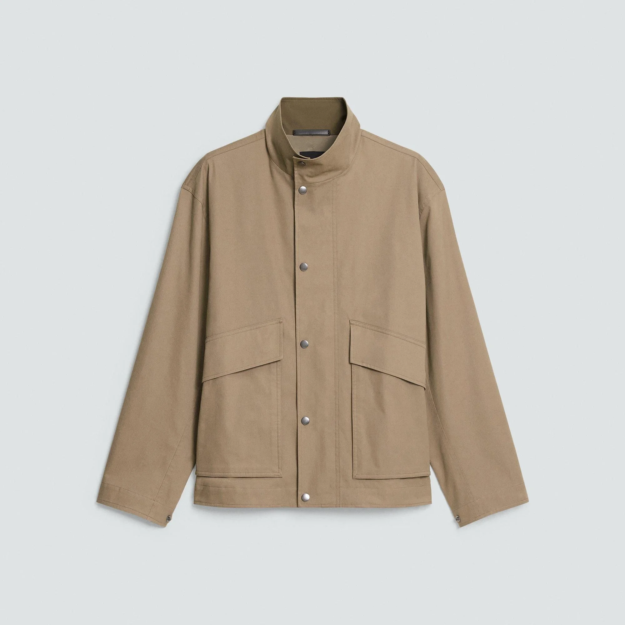 Please enter your email below to be notified when this item is in stock This utility-inspired jacket zips up the front under a snap placket. It features a stand collar, angled flap pockets, and slip pockets on the sides. Cut in our standard fit, it’s woven using a blend of incredibly soft cotton for an easy, smooth silhouette. Style #: P0774413 Please enter your email below to be notified when this item is in stock Fit True to size, choose your normal size Mid-thigh length Model is 6’2”, chest 38” and wearing a US size M Discover the best fit for you on our. Materials & Care Composition 69% cotton 31% polyester Care Do not wash. Do not bleach. Do not tumble dry. Cool iron if needed. Dry clean with any solvent except trichloroethylene. Imported