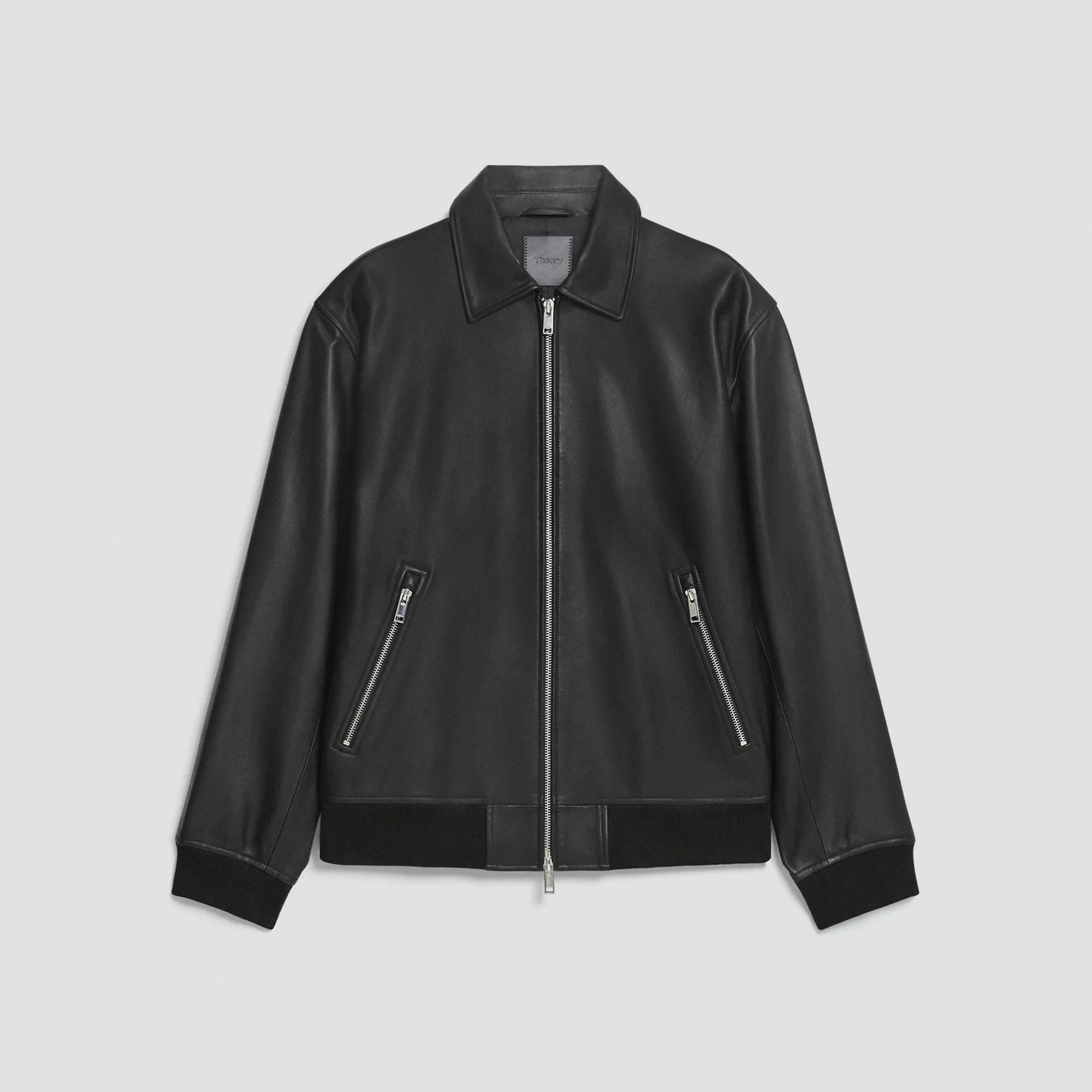 Please enter your email below to be notified when this item is in stock Our blouson jacket is detailed with a spread collar, zip pockets, and ribbed trim. Constructed in our standard fit, this style features slightly dropped shoulders for added ease. It’s crafted from premium lamb leather for a smooth, luxurious feel. Style #: P0871402 Please enter your email below to be notified when this item is in stock Fit True to size, choose your normal size Standard fit, long sleeves Hip length Model is 6’2”, chest 38” and wearing a US size M Discover the best fit for you on our. Materials & Care Composition 100% lamb leather Care Do not wash. Do not bleach. Do not tumble dry. Do not iron. Do not dry clean. Professional leather clean only. Imported