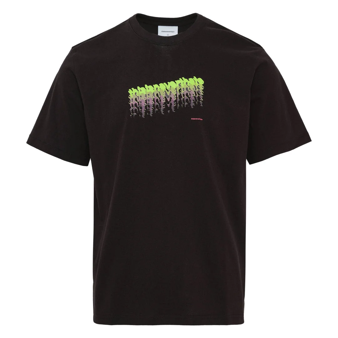 600075153BLK00L / TN253TTSST06/00/BLACK - Gradient logo graphic print - Crew neck construction - Short sleeves - Cotton jersey fabric - Oversized relaxed fit - Ribbed collar and cuffs The thisisneverthat Ambiguous Logo Tee delivers contemporary streetwear with bold graphic design and premium construction. Crafted from soft cotton jersey in classic black, featuring the brand's signature logo in gradient green-to-purple print across the chest. The oversized fit and quality materials create a versatile statement piece for modern urban wardrobes.