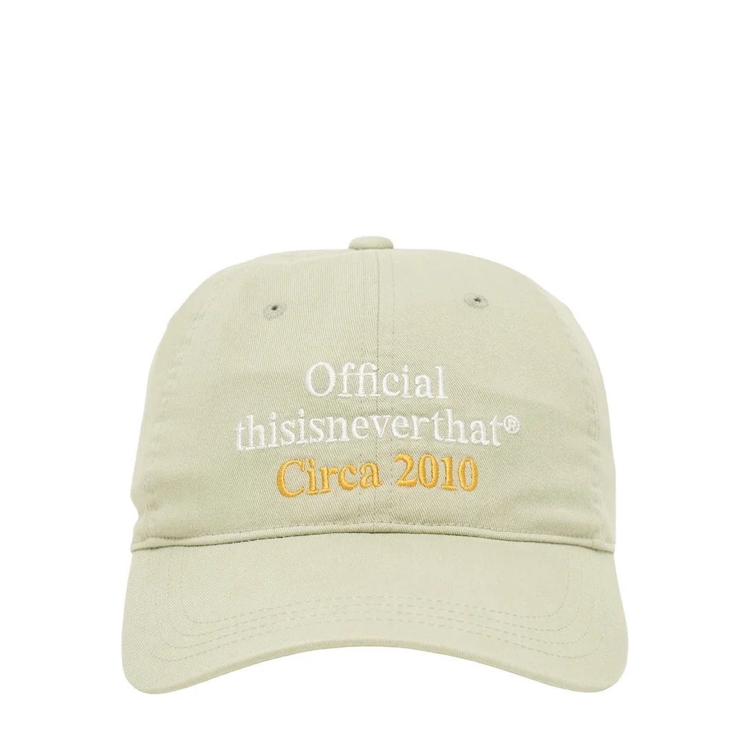 600075157GRN0OS / TN253WHWBC03/00/LIGHT GREEN - Embroidered front text detail - Classic six-panel construction - Cotton twill fabrication - Adjustable back closure - Curved brim - Unstructured fit The thisisneverthat Official Circa 2010 Cap delivers nostalgic streetwear style with contemporary craftsmanship and signature brand messaging. Constructed from premium cotton twill in soft sage green, featuring embroidered text detailing and classic six-panel construction. The vintage-inspired colorway and branded embroidery create an authentic streetwear statement piece.