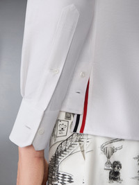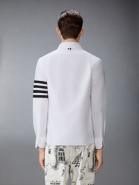 Cut in crisp cotton with a straight fit, this shirt is marked by the 4-bar motif—a recurring symbol of discipline and design clarity in the Thom Browne vocabulary. Balanced by a stepped hem and clean placket, it merges heritage shirting with a graphic assertion of identity. Partial front button closure Button-down point collar Patch chest pocket Button-fastening self armbands Buttoned cuffs Pleated back yoke with locker loop Curved hem Name tag applique Signature striped grosgrain loop tab Straight fit Model is 6'1" (185cm), wearing size 1 100% Cotton Combo 1: 100% Silk Made in Italy MWL431C-F0313-100