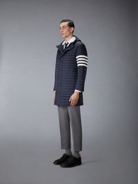 Expertly crafted and down-filled for exceptional warmth, this jacket is designed with both style and function in mind. Featuring sizable zippered pockets, a protective hood, and our iconic 4-bar detailing, it’s a winter essential with character. Front snap button closure 4-bar detailing Side zip pockets Snap button cuffs with signature striped grosgrain trim Interior pocket with name tag 100% Polyamide Combo 1: 100% Polyamide Padding: 80% White Goose Down, 20% White Goose Feathers Lining: 100% Polyester Model is 6'1" (185cm), wearing size 1 Made in Italy MOD013X-05411-415