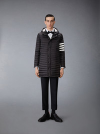 Expertly crafted and down-filled for exceptional warmth, this jacket is designed with both style and function in mind. Featuring sizable zippered pockets, a protective hood, and our iconic 4-bar detailing, it’s a winter essential with character. Front snap button closure 4-bar detailing Side zip pockets Snap button cuffs with signature striped grosgrain trim Interior pocket with name tag 100% Polyamide Combo 1: 100% Polyamide Padding: 80% White Goose Down, 20% White Goose Feathers Lining: 100% Polyester Model is 6'1" (185cm), wearing size 1 Made in Italy MOD013X-05411-001