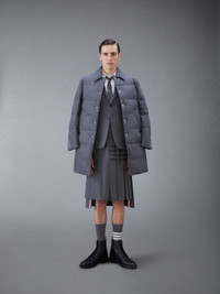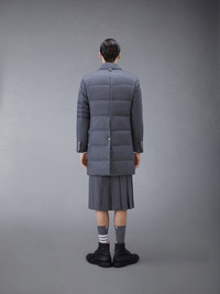 DETAILS & FIT The pinnacle of cold-weather sophistication — our Downfilled Flannel 4-Bar Bal Collar Overcoat. Signature Thom Browne emblems put a twist on fine winter wear. Snap button closure Single back vent Button cuffs Striped lining with Interior pockets and name tag Signature grosgrain loop tab at back of neck Model is 6' 1" (185cm), wearing size 0 95% Wool, 5% Cashmere Padding: 80% White Goose Down, 20% White Goose Feathers Lining: 100% Polyester Made in Italy MOD001Z-06393-035