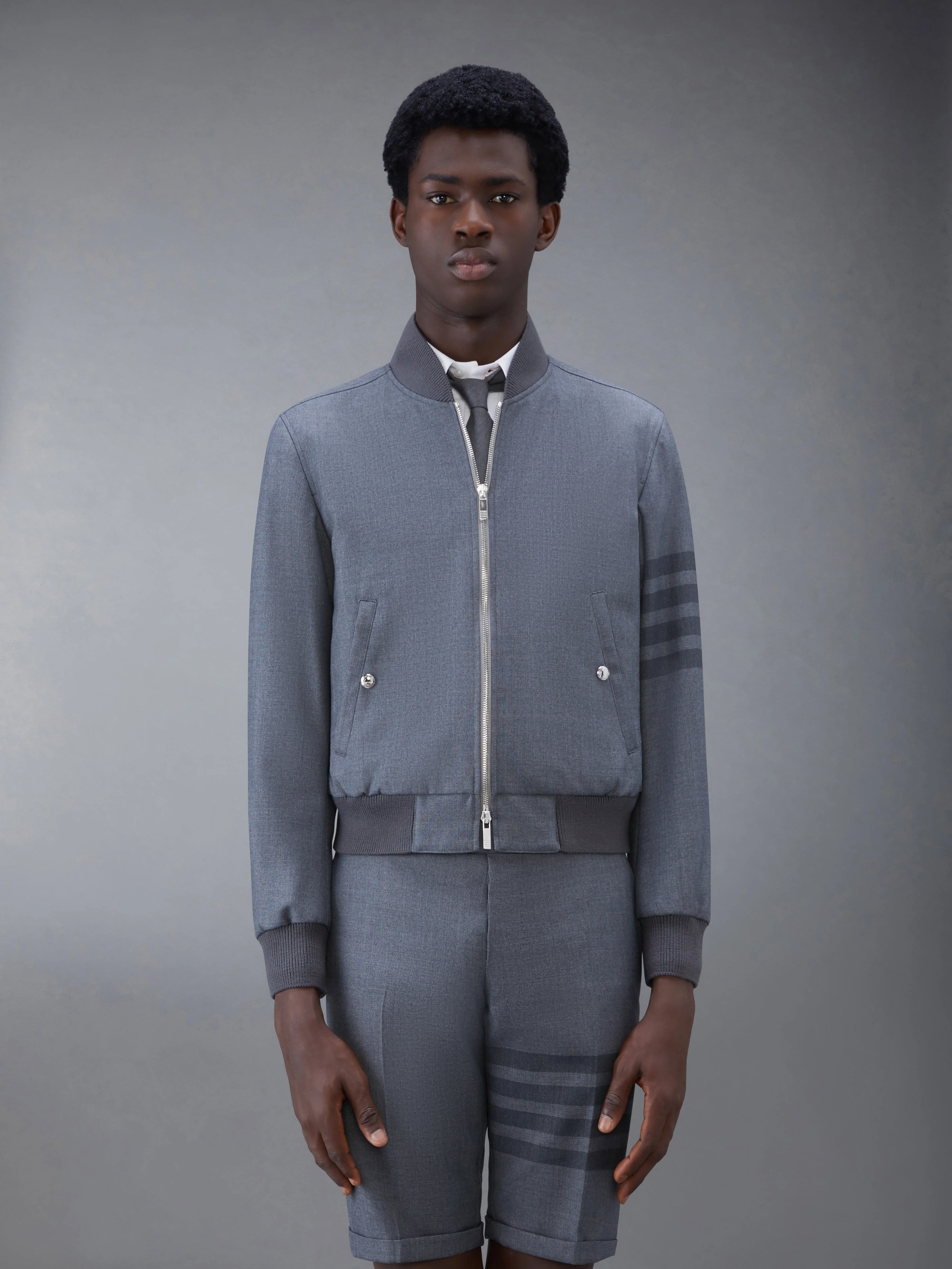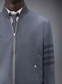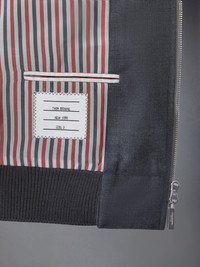 DETAILS & FIT At Thom Browne, uniformity is novel. Our School Uniform 4-Bar Blouson Jacket is a functional closet staple, complete with welt side pockets and a zip front closure. 2-way silver tone zip front closure Rib stand collar, cuffs, and hem Snap fastening welt side pockets Tonal 4-bar stripe detail at left sleeve Striped lining with interior pocket and name tag Signature striped grosgrain loop tab at back of neck Model is 6' 1" (185cm), wearing size 0 50% Wool, 50% Polyester Lining: 100% Cupro Made in Japan MJO030A-04346-035