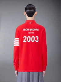Long sleeve polo in red cotton pique with emblazoned '2003' and logo at the back, along with engineered 4-bar stripe details in white on the left sleeve. Partial button placket, a spread collar, and a name tag applique above the hem. Side vents with signature striped grosgrain trim. Signature striped grosgrain loop tab at back of neck. Model is 6' 1" (185cm), wearing size 1 100% Cotton Made in Italy MJP137B-07976-600