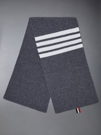 DETAILS & FIT A statement-making essential for cooler months, our Cashmere Rib 4-Bar Scarfis adorned with Thom Browne's signature 4-Bar Stripes. 4-bar stripe detail Signature striped grosgrain loop tab at one end 100% Cashmere Made in Italy MKS026A-00011-025 - WIDTH: 28.0cm - Length: 225.0cm
