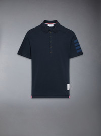 Thom gives the classic preppy polo a shrunken collar. Our 4-bar detailing is seamlessly integrated into the design for a sleek look. Finished with our signature name tag applique above the hem, this piece subtly showcases Thom Browne’s signature elements. 4-bar detailing Partial front button closure Name tag applique Signature striped grosgrain loop tab Model is 6'1" (185cm), wearing size 1 100% Cotton Made in Italy MJP192B-07323-415
