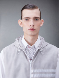 DETAILS & FIT A breathable layer perfect for exercise or running errands during humid spring days. Our Ripstop fabric is ultra-durable, tear and rip-resistant with a water-repellent finish. Layer over any of our signature dress shirts or casual tops. Front zip closure 4-bar detailing Slip side pockets Drawstring hood Model is 6' 1" (185cm), wearing size 0 100% Polyamide Combo1: 100% Cotton Made in Italy MJV007A-F0517-055