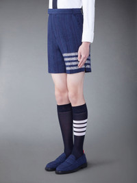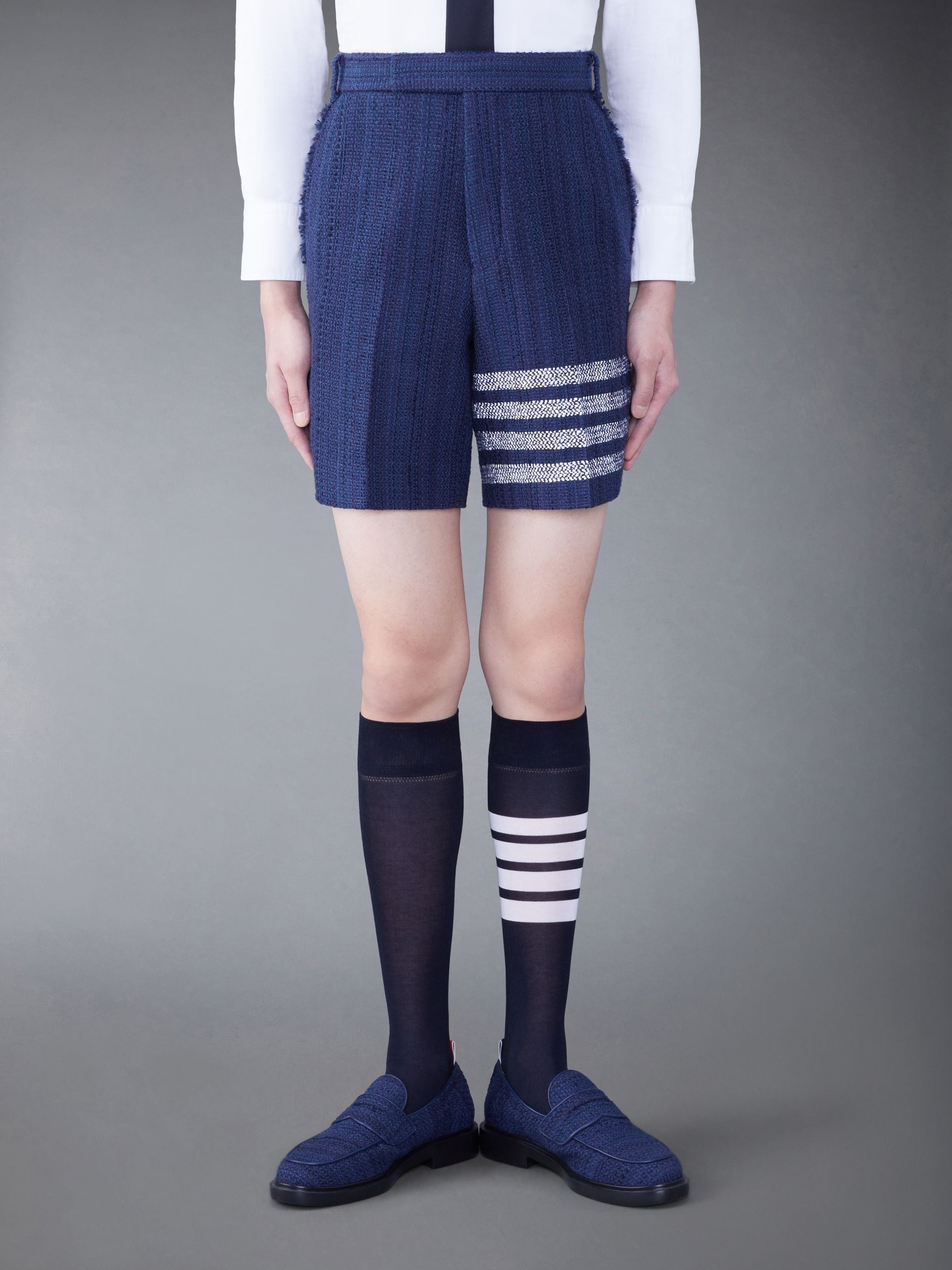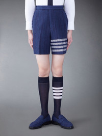 DETAILS & FIT Sophisticated shorts with a high hem that pays homage to Thom Browne’s distinguished tailoring. Our fine tweed fabric is sourced from a fabric mill founded in 1912 in Carlisle, England. Tab front closure 4-Bar detailing Slip side pockets Button-fastening back welt pockets Signature striped grosgrain loop tab Fit 2 - Sack fit Model is 6' 1" (185cm), wearing size 0 40% Polyester, 38% Acrylic, 13% Wool, 6% Cotton, 1% Polyamide, 1% Acetate, 1% Viscose Lining: 100% Cupro MTC221T-F0513-415