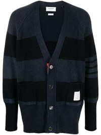 4-Bar striped cashmere cardigan Thom Browne puts a hallmark twist on a classic cardigan with this design. It’s spun from cashmere with tonal stripes and a signature 4-Bar adornment on the left sleeve. The iconic RWB grosgrain loop adds a statement finishing touch at the nape. Highlights - Navy blue - Cashmere - Knitted construction - Horizontal stripe pattern - Applique logo - Signature 4-bar stripe - Rwb stripe - V-neck - Front button fastening - Long raglan sleeves - Two front patch pockets - Ribbed cuffs and hem Made in Italy Composition Cashmere 100% SIZE & FIT Model measurements Height 6 ft 2 in(1.88 m) Bust/Chest 36.61 in(93 cm) Hips 35.82 in(91 cm) Waist 27.95 in(71 cm) FittingInformation Designed to be unstructured, offering a loose fit throughout Made with a midweight knit, this piece offers some stretch This piece fits true to size – take your usual size