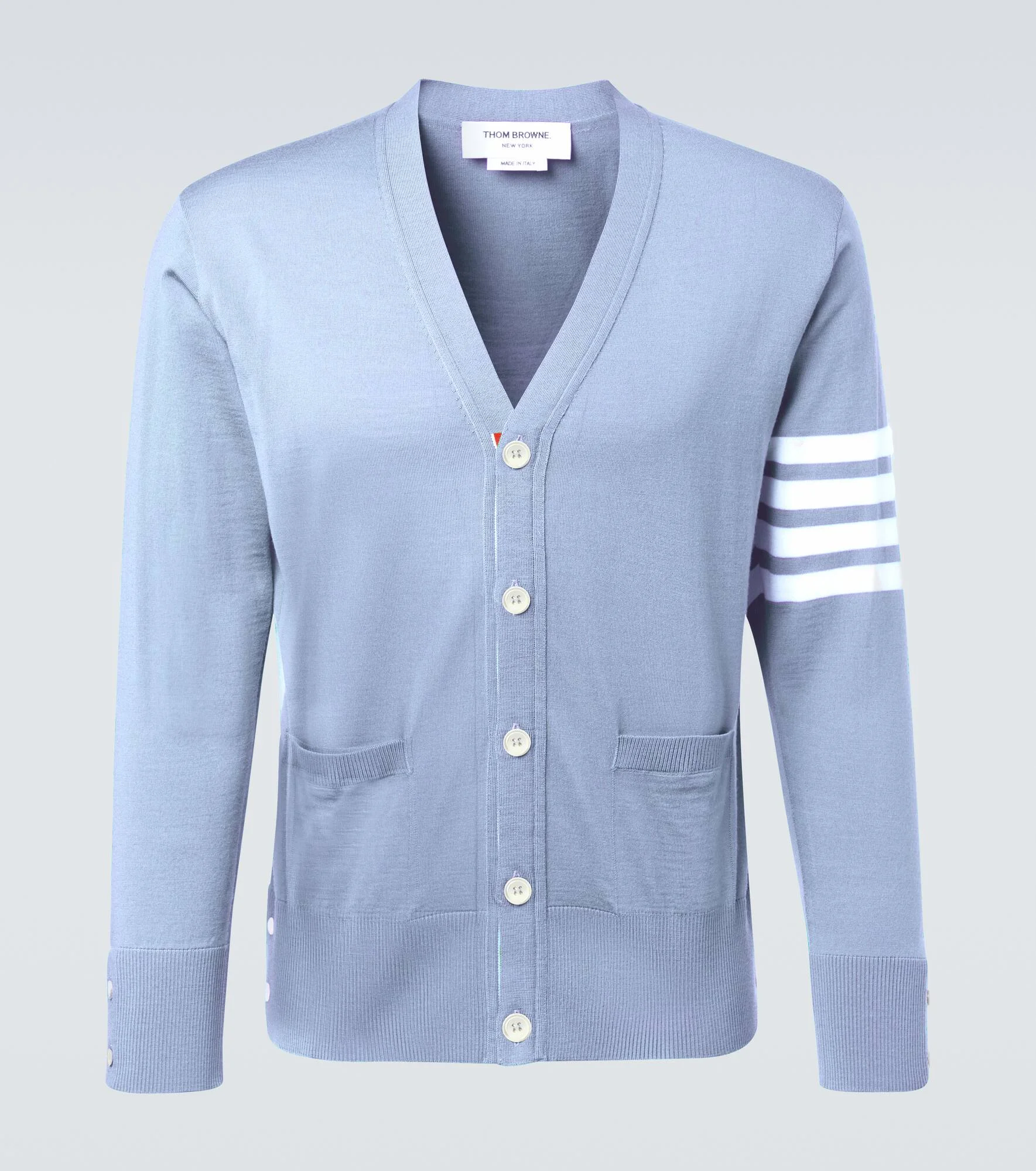 Contrasting 4-Bar horizontal stripes are a Thom Browne signature, dubbing the label’s designs as a ''modern uniform''. The classic pattern now features on this cardigan, complementing the soft virgin wool construction. Product Details - Material: 100% virgin wool - Care instructions: dry clean - Made in Italy - Designer color name: Lt Blue - Item color: blue - Closure: buttoned front - Contains non-textile parts of animal origin - Cuff: ribbed, buttoned - Hem: ribbed - Item number: P01112704 Size & Fit - True to size - For a looser fit, we recommend taking one size up - Slim fit - Stretchy fabric - Slightly cropped - The model in the picture is 185cm-6'1" and wearing a size 3
