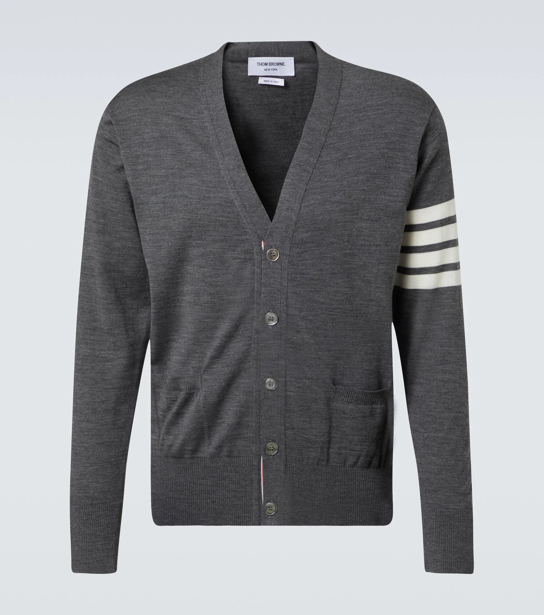 This grey Thom Browne cardigan is packed with details: from the stripes on the sleeves to the elongated ribbed cuffs and waistband, each of which is buttoned and lined with the brand's tricolor grosgrain. Product Details - Material: 100% wool (merino wool) - Made in Italy - Pockets: patch pockets - Designer color name: Med Grey - Buttoned cuffs - Closure: buttoned front - Care instructions: dry clean - Item number: P00431800 Size & Fit - True to size - Straight fit - Stretchy fabric - Falls to the hip - The model in the picture is 185cm-6'1" and wearing a size 2