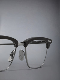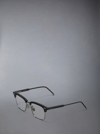Taking inspiration from the past to create something new, our eyewear is a story of evolution. These classic rectangular frames are crafted from ultra-lightweight, durable silver-plated titanium, engineered to withstand drops, impact, and the demands of everyday use. Japanese acetate lenses offer stunning optical clarity and 100% UVA/UVB protection. Ergonomic nose pads gently embrace the bridge of the nose, providing a comfortable, pressure-free fit for extended wear. Finished with Thom’s signature red, white, and blue trim at the temple tips and 4-bar detailing engraved at the nose pads, these glasses exemplify Thom's commitment to precision, craftsmanship, and enduring quality. Dark grey acetate with silver plate titanium frame Lens color: Clear - ar Adjustable nose pads Eco-Leather case with Signature striped grosgrain loop tab at entry Signature tricolor detailing at temple tips Eyewear pouch Standard cleaning cloth (20cm x 20cm) Lens Width: 52mm Nose Bridge Length: 19mm Temple Length: 145mm 50% Titanium, 50% Acetate Made in Japan UEO711A-G0003-020