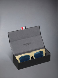 These frames reveal volume through fluid form and linear precision. Made in Japan from high-quality acetate, the silhouette reflects Thom Browne’s continual study of proportion and craft, expressed with bold dimensionality. Anti-reflective lenses reduce glare, enhance optical clarity, while signature 4-bar detailing and tricolor enamel temple tips complete the design. Rectangular shape Signature 4-bar Striped enamel temple tips Eco-leather case Frame: toasted yellow acetate Hinges: silver Lenses: dark navy-ar Lens Width: 52mm Nose Bridge Length: 18mm Temple Length: 148mm 100% Acetate Made in Japan UES947A-G0002-735