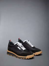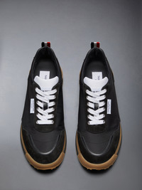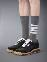 DETAILS & FIT Leisurewear made artful. These comfortable alumni trainers pair perfectly with any of our fine suits or casual wear. Lace up closure Leather lining Rubber sole Signature striped grosgrain loop tabs Combo2: 100% Calf Leather Upper: 73% Polyester, 27% Polyamide Lining: 100% Calf Leather Sole: 100% Rubber Made in Italy MFD271B-F0488-001