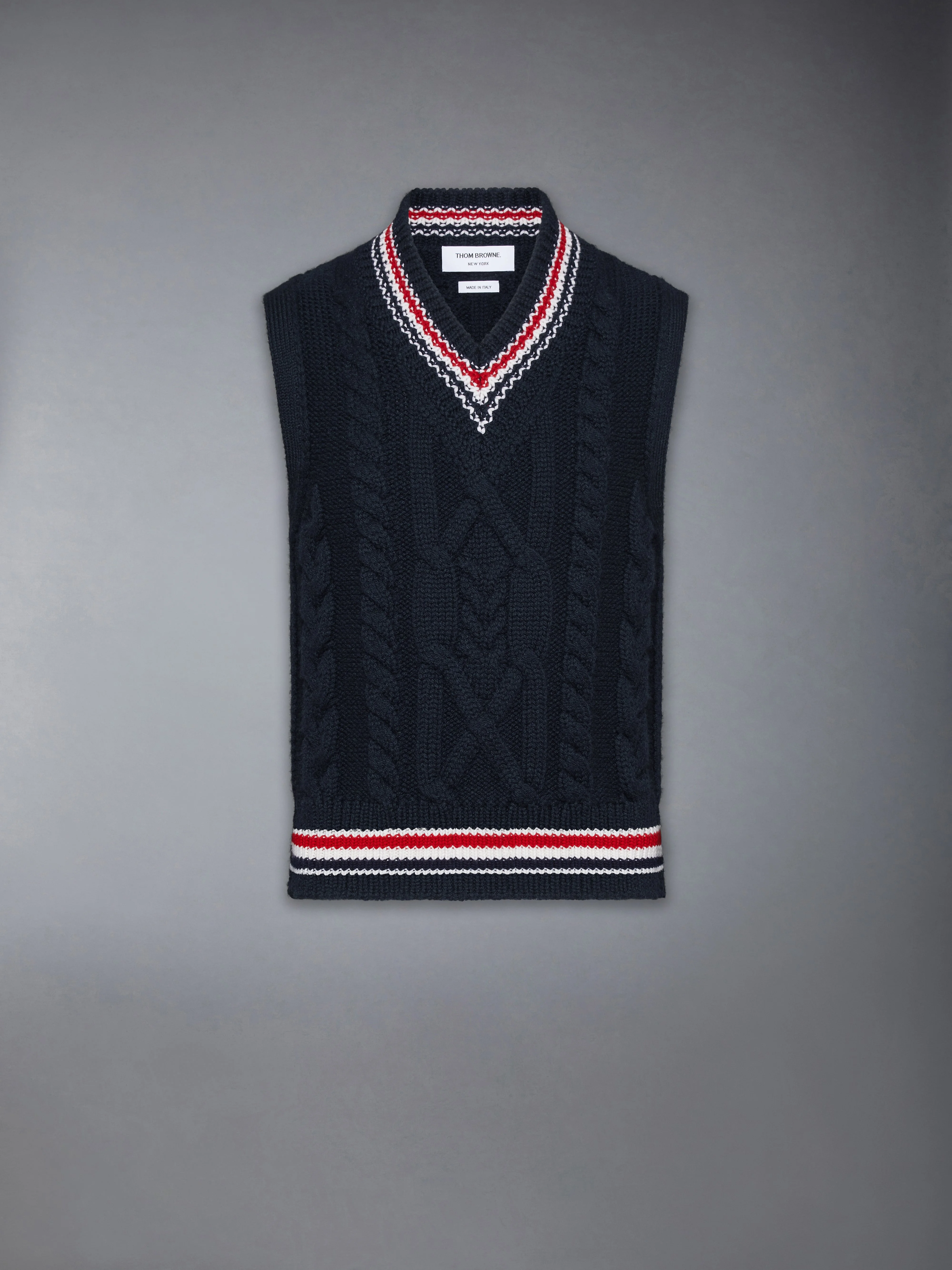 Inspired by midcentury cricket uniforms, this luxurious vest honors our sporty heritage. Bold cricket stripes frame the neckline in signature RWB colors. Casual yet elegant, this versatile piece layers effortlessly over shirting or makes a statement on its own. Buttoned side vents with signature striped grosgrain trim Signature striped grosgrain loop tab Model is 6'1" (185cm), wearing size 1 98% Wool, 1% Elastane, 1% Polyamide Made in Italy MKV094A-Y1005-415