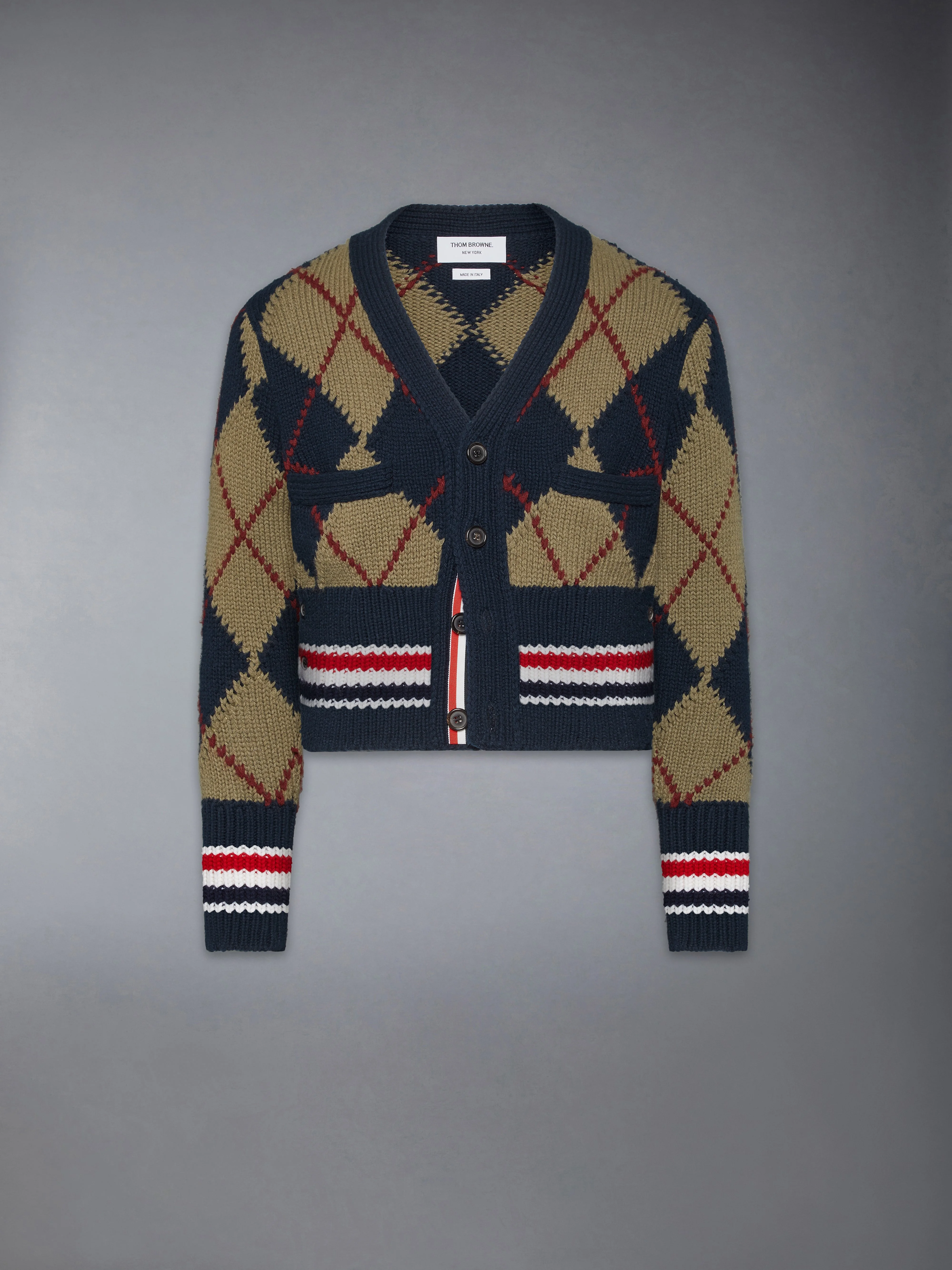 MERINO WOOL ARGYLE INTARSIA V NECK CARDIGAN