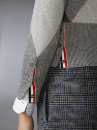 A timeless argyle sweater reimagined with Thom Browne's signature touch. Grosgrain trim at the front, cuffs, and side vents is a subtle reminder of Thom's commitment to subverting classic wear. A fresh take on tradition, blending sophistication with modern craftsmanship. Front button closure with striped grosgrain placket 2 Front slip pockets Buttoned cuffs with signature striped grosgrain trim Buttoned side vents with signature striped grosgrain trim Signature striped grosgrain loop tab Model is 6'1" (185cm), wearing size 1 100% Cotton Combo 2: 100% Polyester Made in Italy MKC601A-Y2001-055