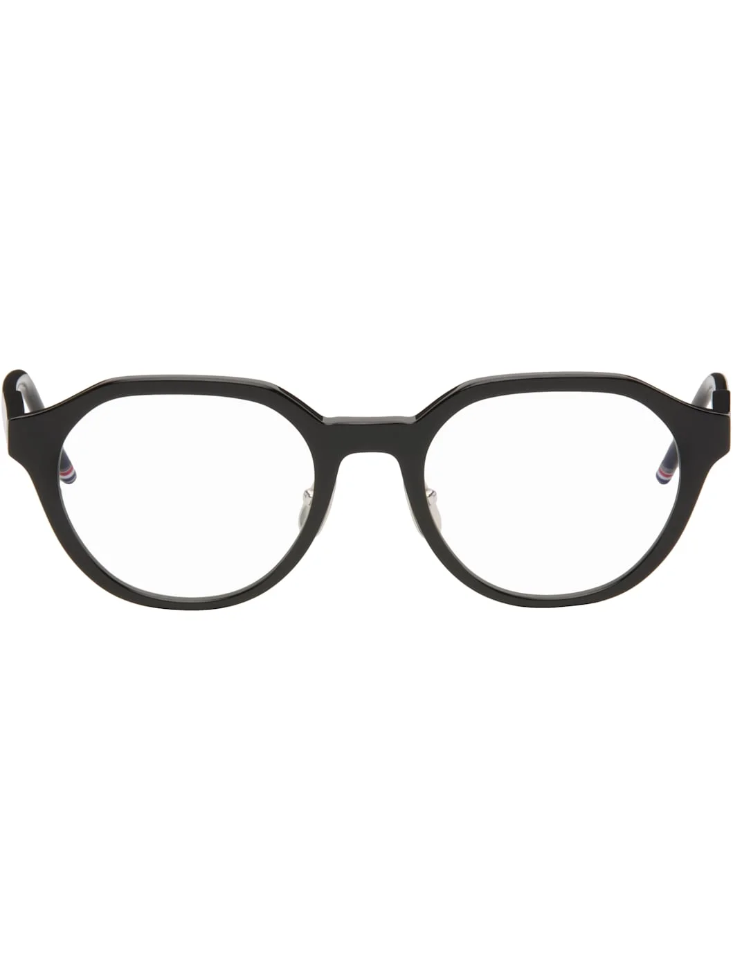Oval acetate-frame optical glasses. · Adjustable metal nose pads · Enameled tricolor stripes at temple tips · Includes case · Size: 49.21 148 Supplier color: Black Acetate. Made in Japan 252381M133029