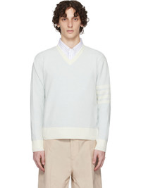 Knit linen- and cotton-blend sweater. · Rib-knit V-neck, hem, and cuffs · Stripes at sleeve · Tricolor grosgrain flag at back collar Supplier color: Light blue 68% linen, 32% cotton. Made in Italy 252381M206003