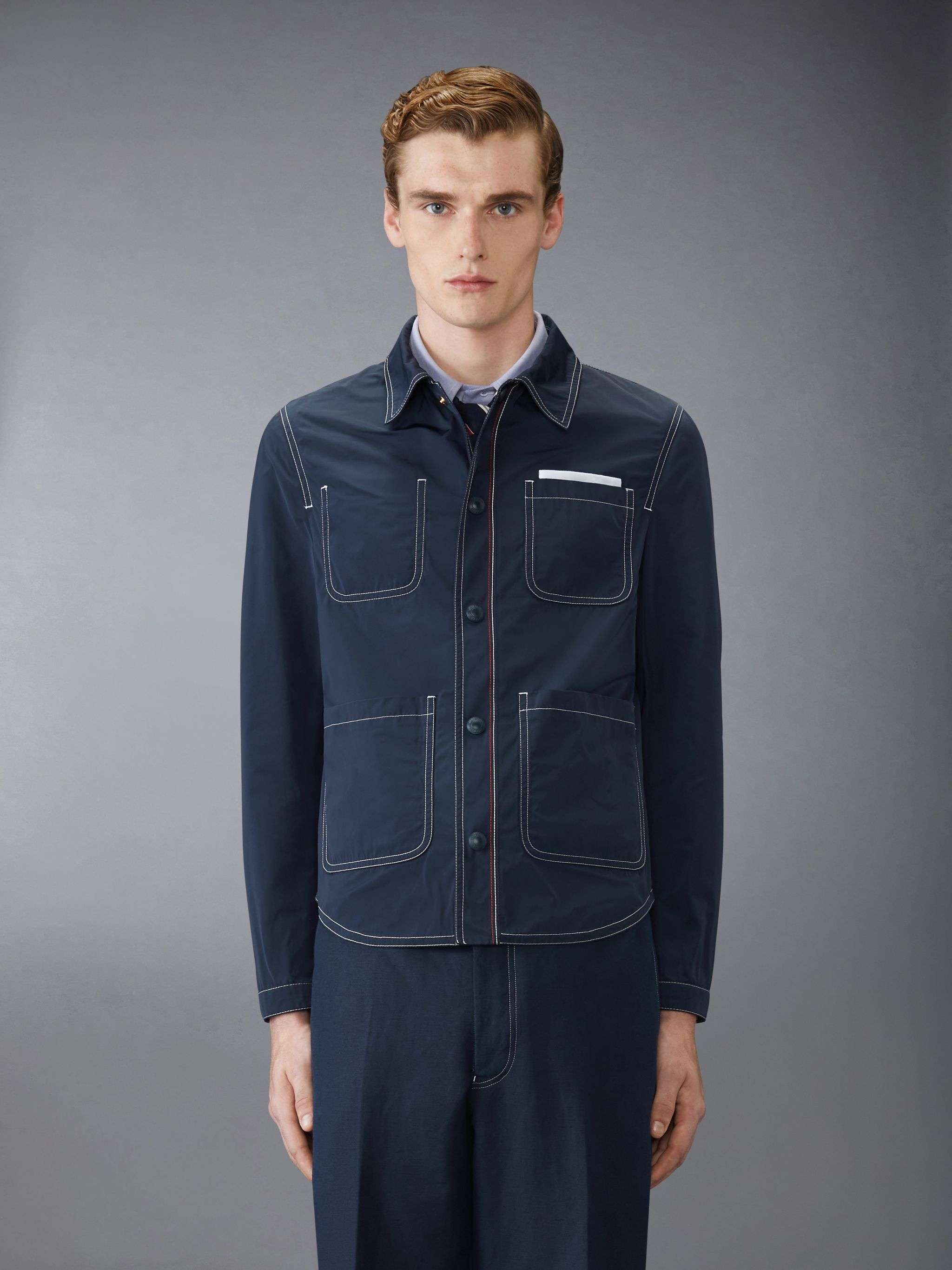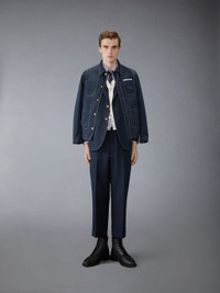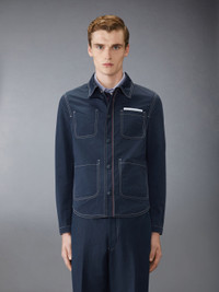 DETAILS & FIT A weighted layer perfect for cool spring nights, this one-of-a-kind utility jacket strikes the balance between refined suiting and casual wear. Crafted in fine fabric. Front button closure 3 Front patch pockets Interior pocket with name tag Signature striped grosgrain loop tab Model is 6'1" (185cm), wearing size 1 100% Polyester Lining: 100% Cupro Made in Italy MJO220S-F0725-415