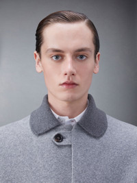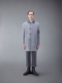DETAILS & FIT Car coat in grey Milano stitch boiled wool with contrast rib collar and 4-bar stripe detail at left sleeve in deeper grey. Front button closure, patch front pockets, button-fastening single back vent. Signature striped grosgrain loop tab at back of neck. Model is 6' 1" (185cm), wearing size 0. 94% Virgin Wool, 5% Polyamide, 1% Elastane Made in Italy MKJ106AY1019055