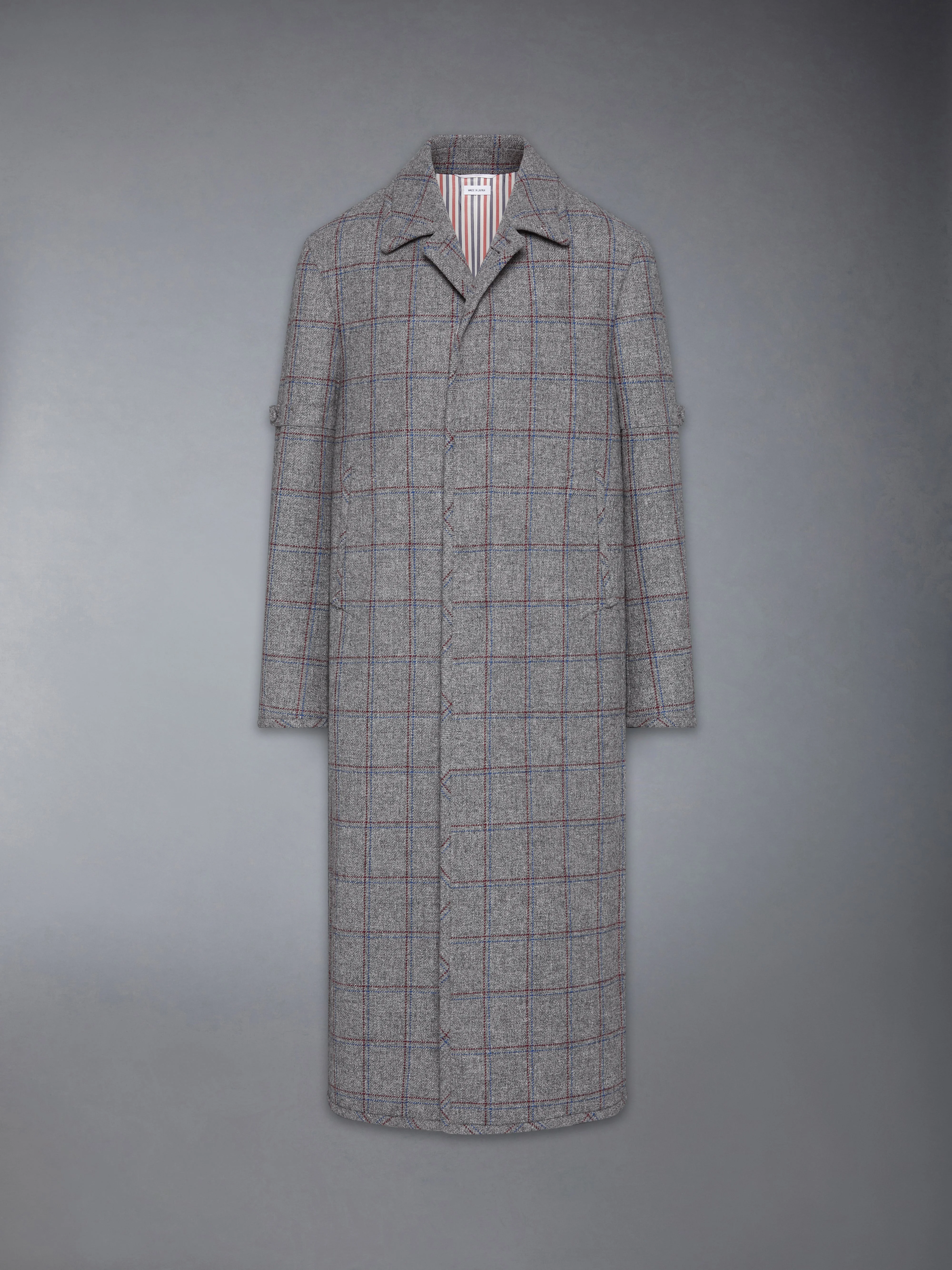 The perfect coat for the season, blending timeless craftsmanship with modern detail. Hallmarks of traditional menswear tailoring are reinterpreted from within—self-covered armbands and buttons—each reflecting Thom’s unwavering devotion to craft. Bold Browne lettering and the number 65—a nod to Thom’s birth year—are rendered in an iconic collegiate font, famously used at Notre Dame. Collegiate heritage is often associated with nostalgia and belonging, and it's deeply personal to Thom. This garment is not just a tribute to school pride but a symbol of the enduring desire to be part of something greater. Hidden front button closure Side slip pockets Buttoned armbands Interior pocket with name tag Buttoned cuffs with signature striped grosgrain trim Single back vent Signature striped grosgrain loop tab Model is 6'1" (185cm), wearing size 1 100% Wool Lining: 100% Cupro Made in Italy MOR157E-F1003-035