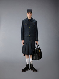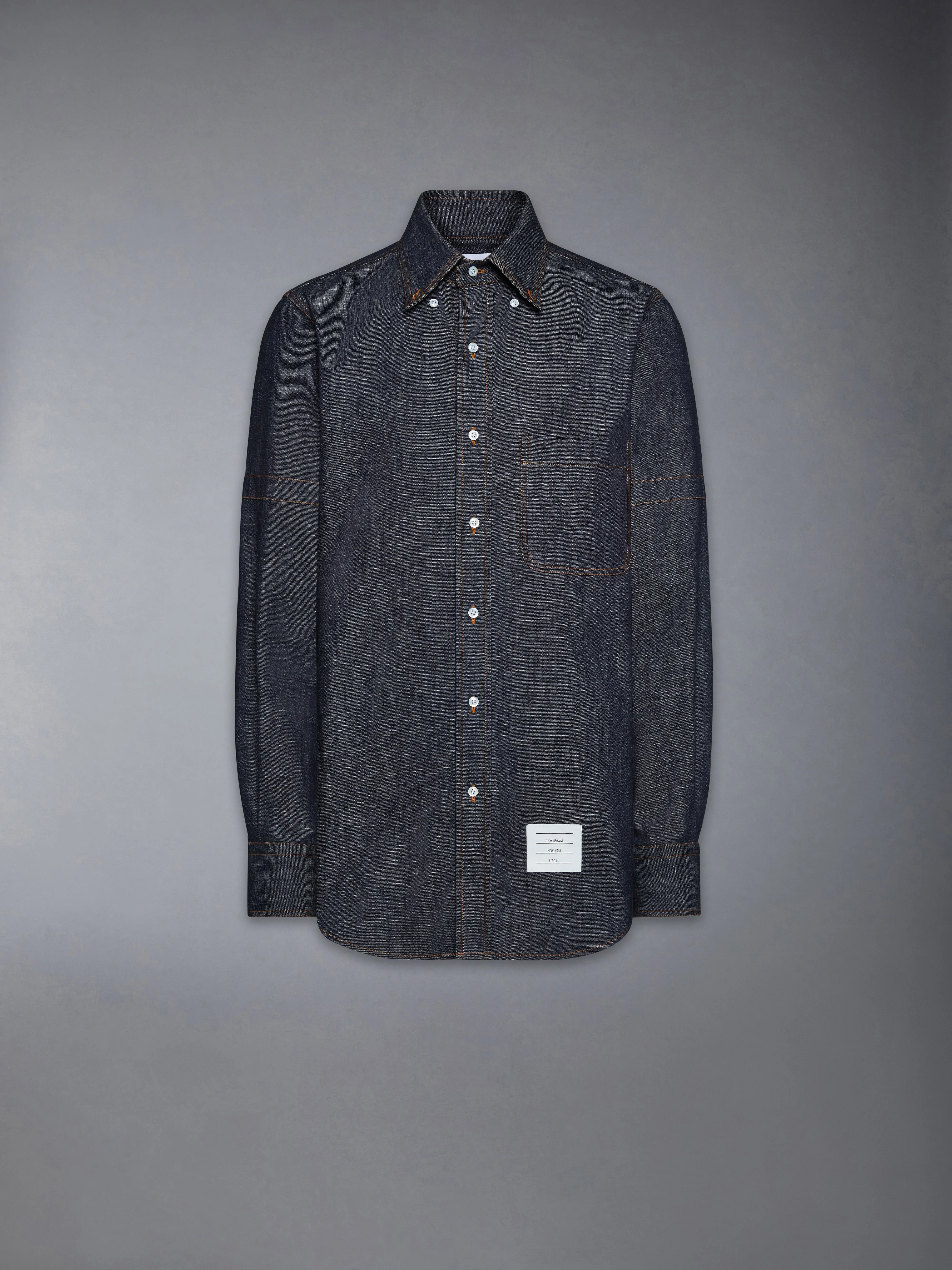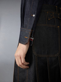 Cut in lightweight 7.6 oz shirting denim, this long-sleeve button-down reimagines classic tailoring through the Thom Browne lens. The raw indigo finish lends depth and richness to the surface, designed to soften and evolve with wear while a crosshatch weave adds subtle texture. Pair with pieces from the Japanese Selvedge Denim selection for a coordinated look. Front button closure Button-down point collar Patch chest pocket Button-fastening self armbands Buttoned cuffs with internal RWB grosgrain trim Pleated back yoke with locker loop Curved hem Name tag applique Signature striped grosgrain loop tab Straight fit Model is 6'1" (185cm), wearing size 1 100% Cotton Made in Italy MWL435S-F1105-415
