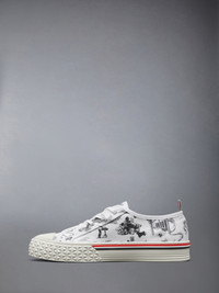 A collegiate classic seen through Thom Browne’s playful lens. Crafted in canvas printed with the season’s Hector toile, this low-top trainer marks ten years of the brand’s beloved icon, contrasting familiar campus style with a touch of whimsy. Set on a tartan-patterned sole, it bridges sport and storytelling in equal measure. Lace-up closure Textured toe cap and bumper Tricolor welt stripes Rubber sole with tartan pattern Calf leather lining Signature striped grosgrain loop tab Combo 1: 100% Calf Full Grain Leather Upper: 100% Cotton Sole: 100% Rubber Lining: 100% Cotton Made in Italy MFD253A-F1169-980
