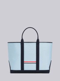 DETAILS & FIT Medium tool tote in light blue and navy canvas with interlock backing. Rounded stitched canvas top handles, snap button fastening top with leather piping. Striped webbing details at front and back. Striped lining with interior zip pocket. Signature striped grosgrain loop tab at entry. 73% Cotton, 27% Polyester Made in Italy UAG013F05390451