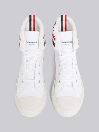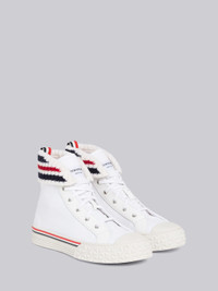 DETAILS & FIT Collegiate high top sneaker in white canvas with striped rib knit cuff detail and tartan textured tonal rubber sole. Metal grommeted lace up closure with white cotton laces and pebble grain leather detail. Logo flag at tongue. Textured white rubber toe cap and sole with stripe detail through outsole. Signature striped grosgrain loop tab at heel. Sole: 100% Rubber Made in Italy MFD244A01588100