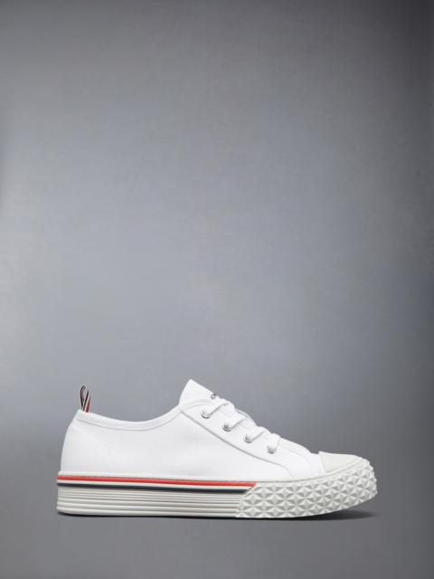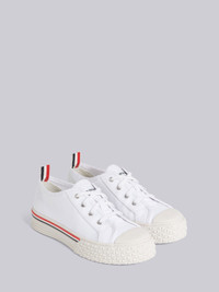 DETAILS & FIT Collegiate low top trainer in white canvas with tartan textured tonal rubber sole and rubber cap toe. Lace up closure with silver tone grommeted metal eyelets, stripe detail at outsole. Signature striped grosgrain loop tab at heels. Upper: 100% Cotton Sole: 100% Rubber Lining: 100% Cotton Made in Italy MFD253AF0102100 - HEEL: 3.5cm - Sole height: 3.5cm