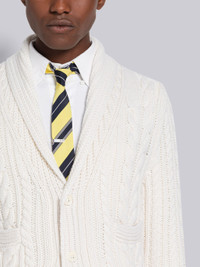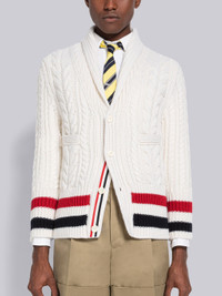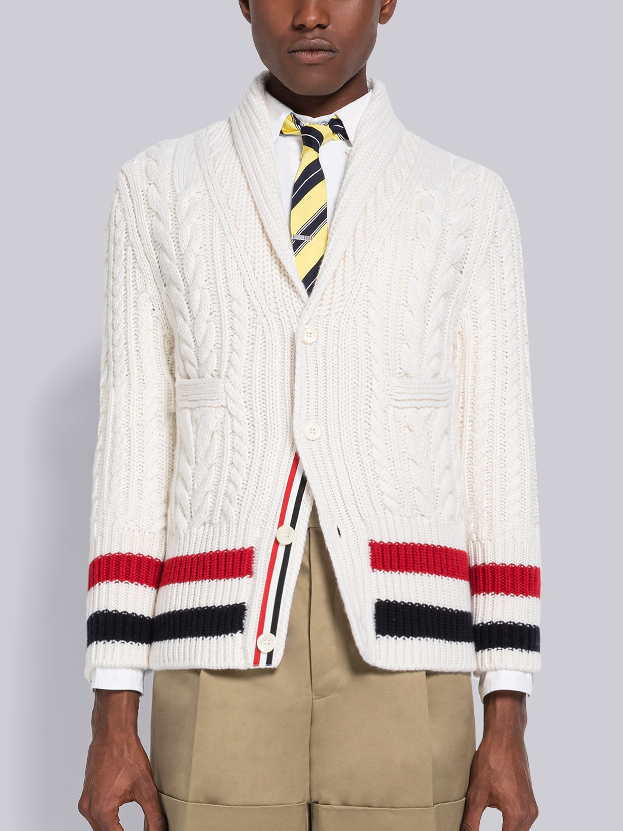 DETAILS & FIT Shawl collar cardigan in white Aran cable cashmere with stripe detail through cuffs and hem. Front button closure with striped grosgrain placket. Buttoned side vents and cuffs with signature striped grosgrain trim. 2 slip front pockets. Ribbed cuffs and hem. Signature striped grosgrain loop tab at back of neck. Model is 6' 1" (185cm), wearing size .0 100% Cashmere Made in Italy MKC412AY2007100