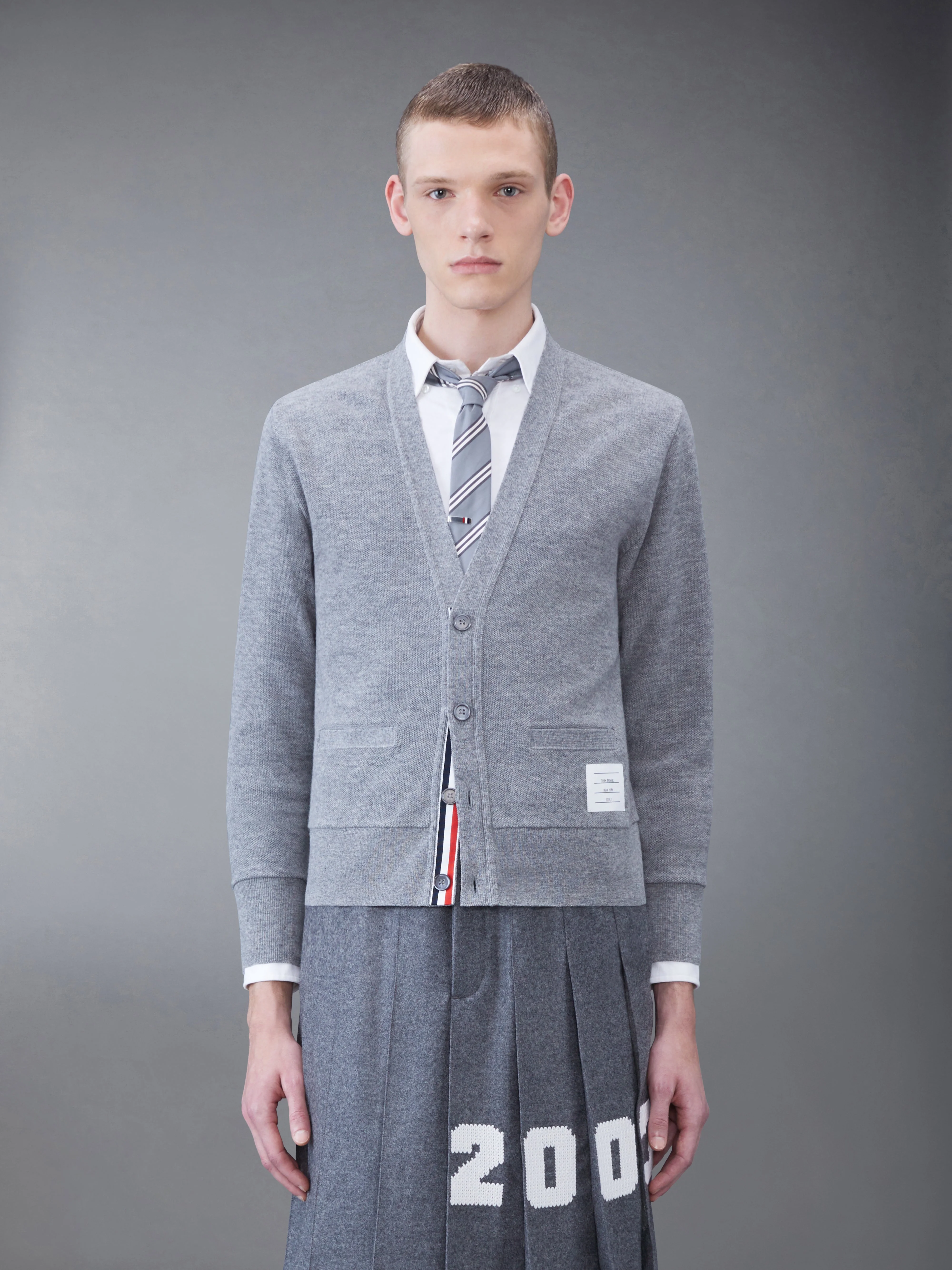 DETAILS & FIT V-neck cardigan in grey cashmere pique with V-stitch '2003' embroidery at back in white. Front button closure with striped grosgrain placket, 2 slip front pockets, name tag applique above hem. Buttoned side vents and cuffs with signature striped grosgrain trim. Signature striped grosgrain loop tab at back of neck. Model is 6' 1" (185cm), wearing size 1 100% Cashmere Combo 1: 50% Wool, 50% Acrylic Made in Italy MJT286E-07542-055