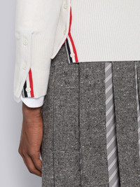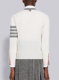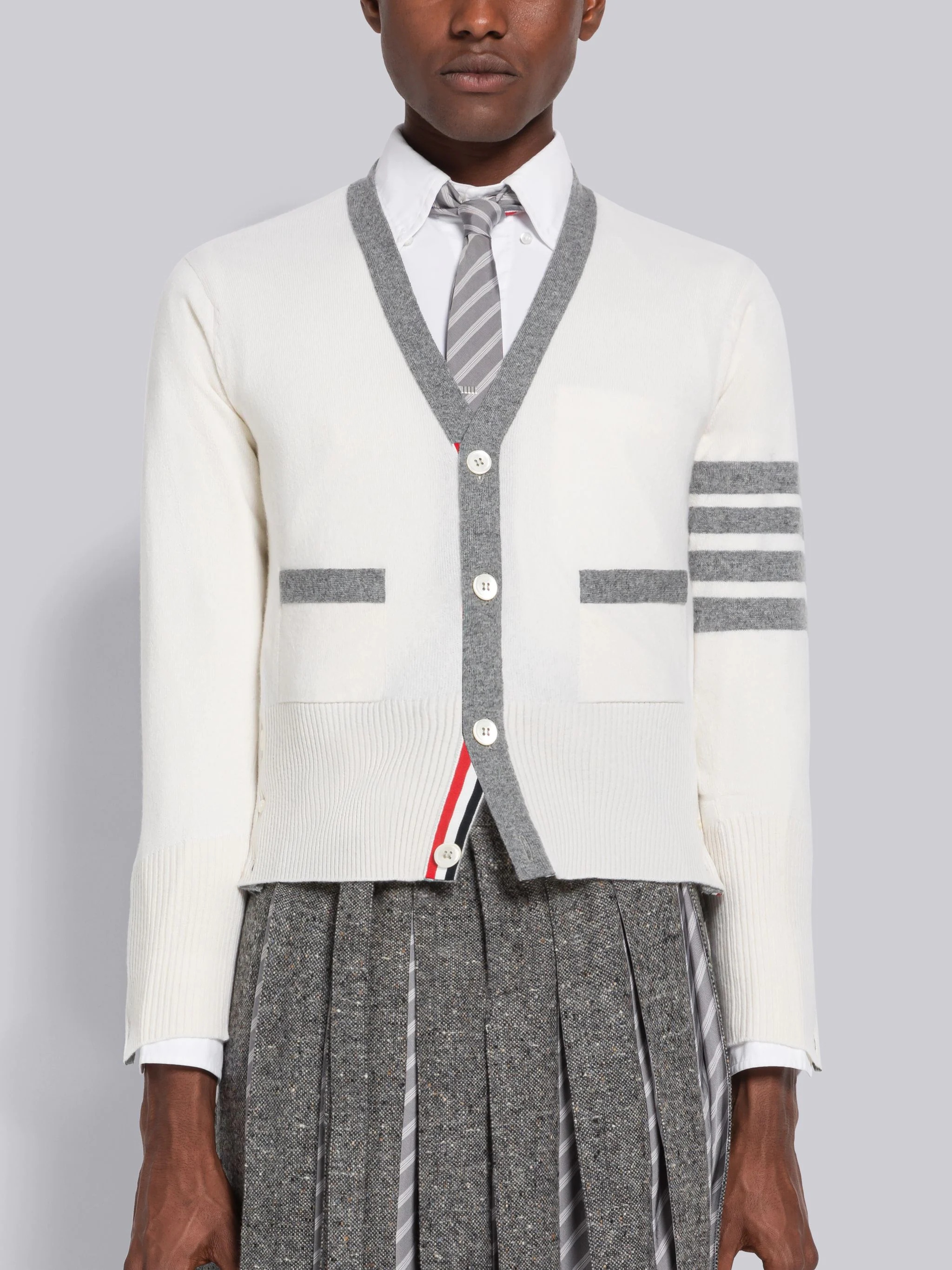DETAILS & FIT Classic V-neck cardigan in white cashmere with contrast trim and 4-bar stripe detail at left sleeve in grey. 2 front slip pockets. Front button closure with striped grosgrain placket. Buttoned side vents and cuffs with signature striped grosgrain trim. Ribbed cuffs and hem. Signature striped grosgrain loop tab at back of neck. Model is 6' 1" (185cm), wearing size .0 100% Cashmere Made in the United Kingdom MKC001D00011100