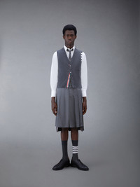 DETAILS & FIT Two Thom Browne emblems define our Classic Cashmere 4-Bar V-neck Cardigan Vest — grosgrain trim and 4-Bar stripe detailing, both synonymous with the brand. Presented in 100% rich cashmere, this vest is a true classic. V-neck Front button closure with striped grosgrain placket 4-bar stripe detail at left shoulder Buttoned side vents with signature striped grosgrain trim Signature striped grosgrain loop tab at back of neck Model is 6' 1" (185cm), wearing size 1 100% Cashmere Made in the UK MKV001A-00011-022
