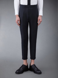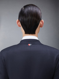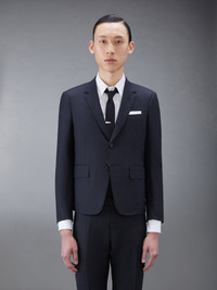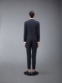 DETAILS & FIT Our Twill Slim Fit Suit and Tie embraces a slimmer fit taken from punk influences while remaining true to Thom Browne’s classic heritage. Since its introduction, the slim-fit suit has maintained its loyal devotees. Front button closure Notched lapels 3 flap front pockets, single chest pocket Buttoned cuffs with signature striped grosgrain trim Double back vent Striped sport coat lining with interior pocket and name tag Tab trouser closure Adjustable buttoned side tabs Slip side pockets, Button-fastening jetted hip pockets Creased legs Narrow cuffs Signature striped grosgrain loop tab at back of neck and waist Classic slim tie High ArmholeFit 3 Model is 6' 1" (185cm), wearing size 0 100% Wool Lining: 100% Cupro Made in Italy MSC159A-00626-015