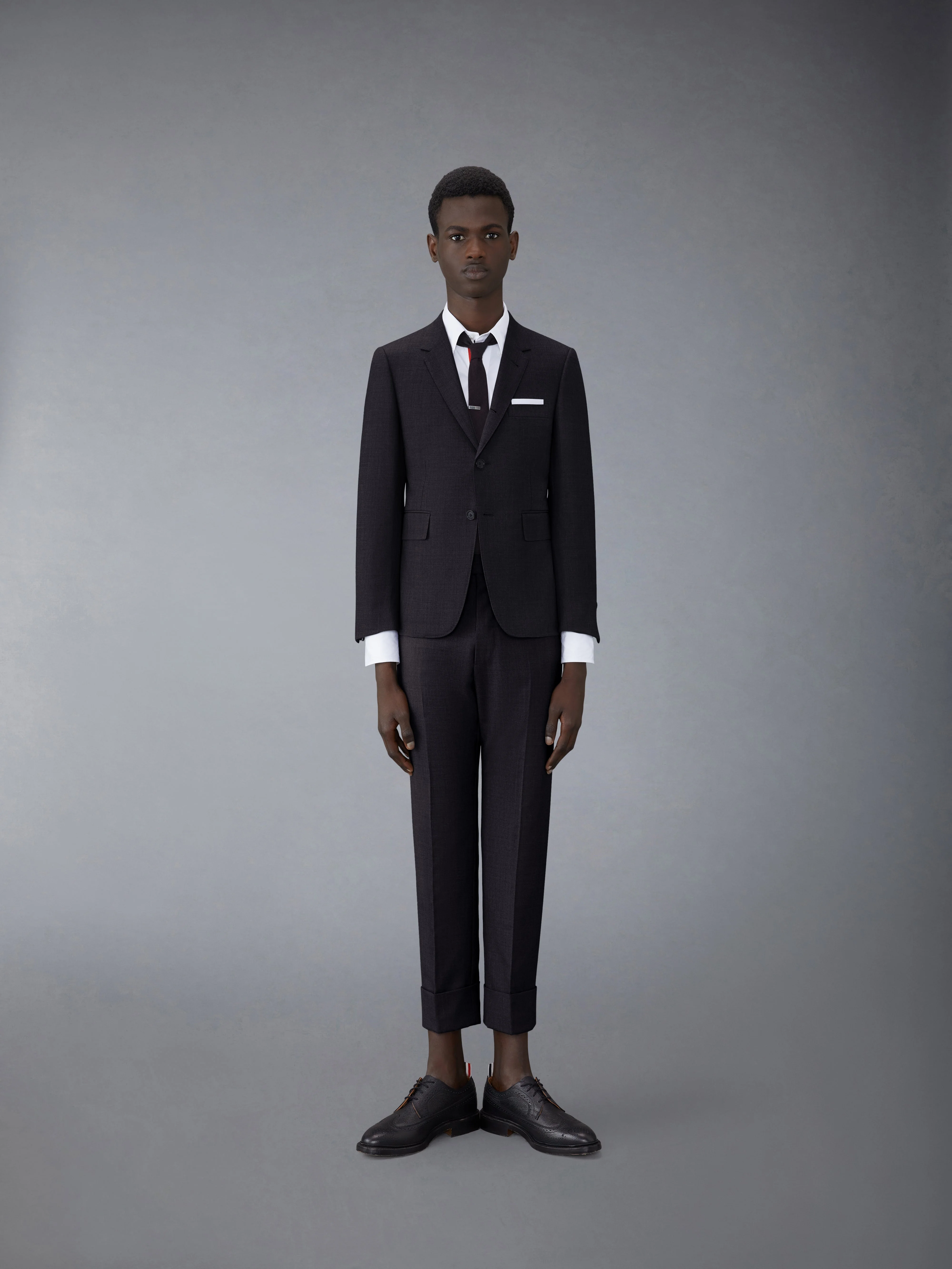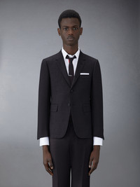 Classic suit and tie in charcoal super 120's wool twill. Single-breasted sport coat with notched lapels, 2 flap pockets, single chest pocket. Double back vent. Signature striped grosgrain trim at buttoned cuffs. Trouser with adjustable backstrap, jetted hip pockets. Signature striped grosgrain loop tab at back of neck and waist. Classic - Fit 1. Model is 6' 1"; (185cm), wearing size 1. 100% Wool Made in Italy MSC001A-00626-015