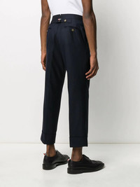 300047638NVY-00 / C5MTC001A-00626/00/415 - Signature backstrap detail - High-waisted construction - Cropped ankle length - Pressed front creases - Premium wool construction - Slim tailored fit Thom Browne Classic Backstrap Trouser delivers tailored sophistication with the brand's signature architectural precision. Crafted from premium wool in sophisticated navy, featuring the distinctive backstrap detail and impeccable construction throughout. The refined silhouette and signature Thom Browne tailoring create a distinguished piece for the modern gentleman's wardrobe.